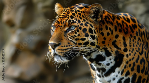 © Liel, Naklejka premium A tight shot of a leopard's face, backdrop blurred with rocks and a stone wall