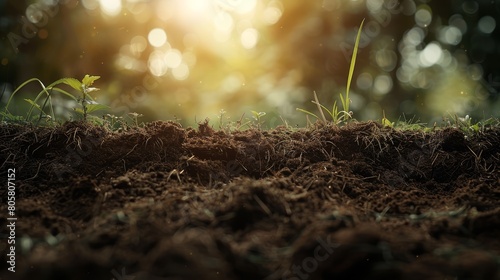 © Mikus, Fototapeta premium A tight shot of a mound of soil with a plant sprouting from its heart