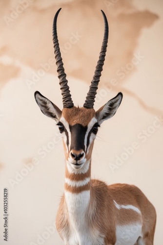 © LoFi J., Fototapeta premium A tight shot of a small antelope with elongated horns atop its head gazes into the camera.