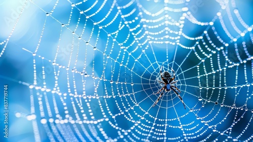 © Mikus, Naklejka premium A tight shot of a spider's web, adorned with water droplets in its heart, against a backdrop of clear blue sky