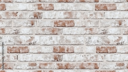 © Albert, Fototapeta premium A tight shot of a textured brick wall, colored with light brown and white paint, devoid of mortar joints