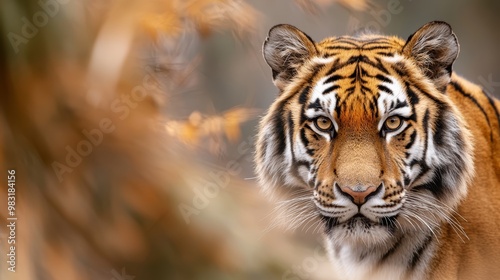 © Wall, Fototapeta premium A tight shot of a tiger's face with a leafy tree's blurred backdrop