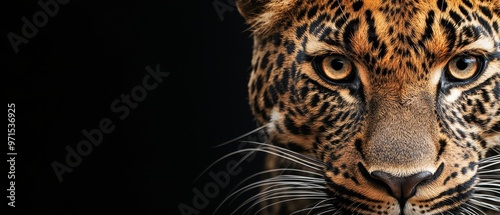 Naklejka premium A tight shot of a tiger's visage against a black backdrop, its features...