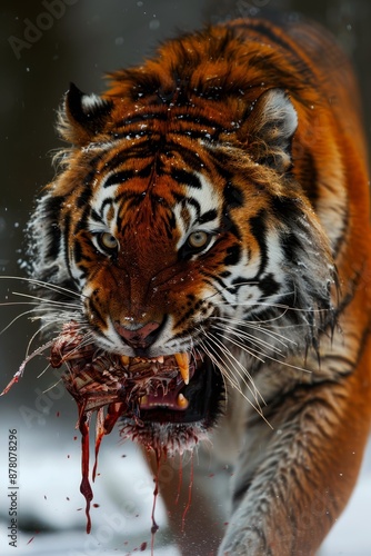 © Viktor, Naklejka premium A tight shot of a tiger taking a bite of food with its mouth open widely