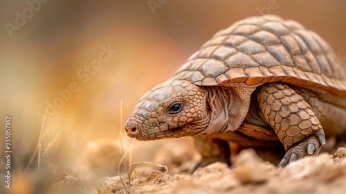 Fototapeta premium A tight shot of a tortoise on dirt, surrounded by near-front grass Background...