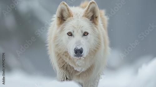 © Viktor, Fototapeta premium A tight shot of a white pooch with snowflakes dotted on its visage against a softly blurred backdrop