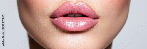 © Viktor, Obraz premium A tight shot of a woman's lips, sporting a gentle pink lipstick coat – applied above and below
