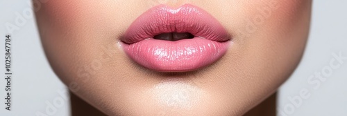 © Viktor, Fototapeta premium A tight shot of a woman's rose-tinted lips, glistening with a drop of pink liquid