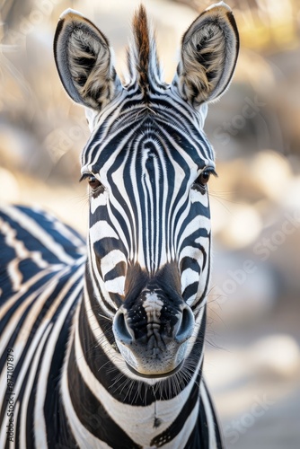 © Viktor, Naklejka premium A tight shot of a zebra's face, background blurred with rocks in the foreground