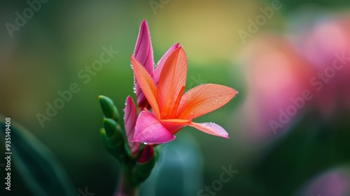 © Viktor, Fototapeta premium A tight shot of an orange-pink bloom with a green stem in sharp focus, and a blurred background
