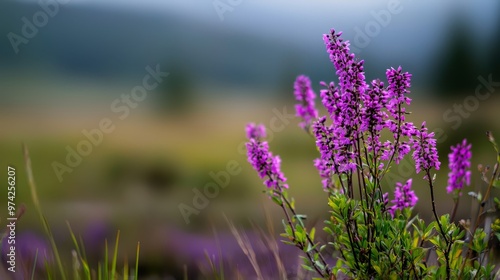 Naklejka premium A tight shot of purple blooms in a field against a backdrop of a distant mountain