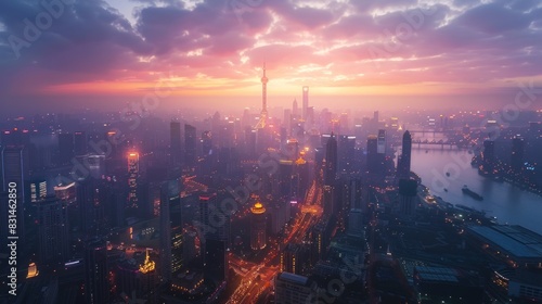 Fototapeta premium A time-lapse of a bustling metropolis transitioning from day to night,...