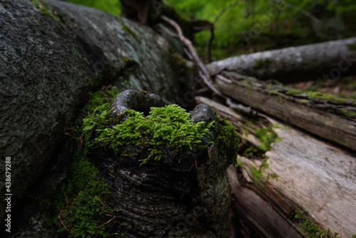 Fototapeta premium A tinder fungus with a characteristic gray bloom and green moss in a natural forest environment