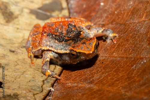 © whitcomberd, Fototapeta premium A tiny and cute Tree Frog on a small leaf and foliage in the tropical rainforest of Borneo at night
