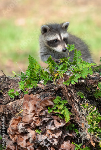 © Lori Labrecque, Naklejka premium A tiny baby raccoon sits on a fallen tree covered with ferns and fungus.