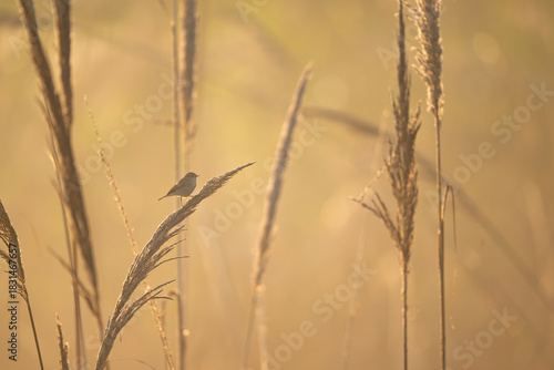 Fototapeta premium A tiny Common Chiffchaff (Phylloscopus collybita) feeding actively on a perch, captured in a dramatic backlit shot. The light creates a striking, glowing outline.