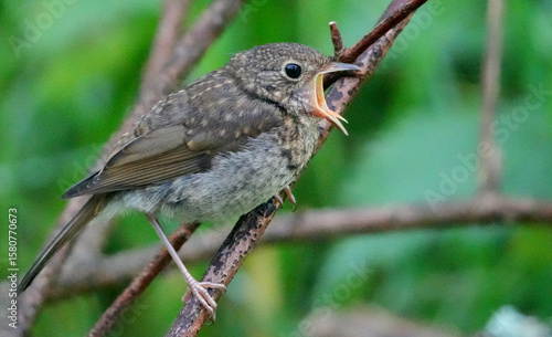 © Flowal93, Fototapeta premium a tiny european wren, Troglodytes troglodytes, chirping on a thin branch