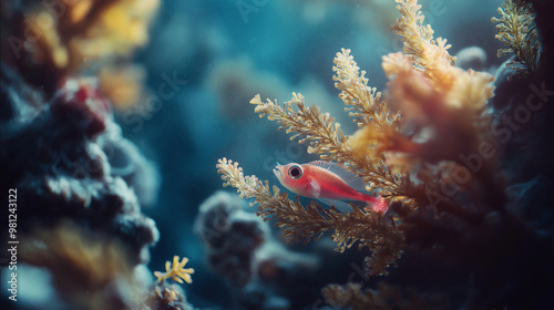 © SB4 GM, Fototapeta premium A tiny goby fish nestled between coral branches, its slim, vibrant body highlighted by the filtered light from above