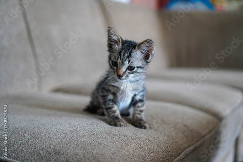 Obraz premium A tiny gray kitten sits on a beige sofa, looking adorable. Adorable Kitten on...