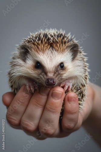 © Fotograf, Fototapeta premium A tiny hedge resting on a person's hand, suitable for various concepts