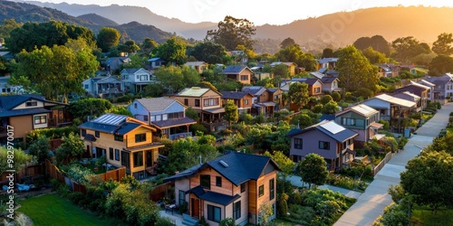 © Sasint, Naklejka premium A tiny home community in a green valley, with a communal garden, solar-powered houses, and residents engaging in sustainable living practices
