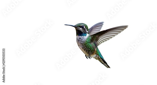 Fototapeta premium A tiny hummingbird hovering mid-air, its iridescent feathers shimmering, isolated on a white background
