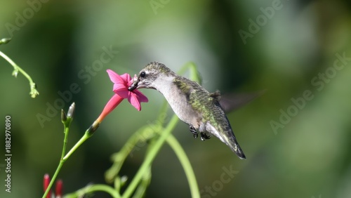 © hellodedigalih, Fototapeta premium A tiny hummingbird hovers gracefully while drinking nectar from a vibrant pink trumpet flower.