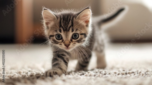 © phattharabodin, Obraz premium A tiny kitten chasing its own tail in circles on a soft carpet, filled with energy and curiosity.