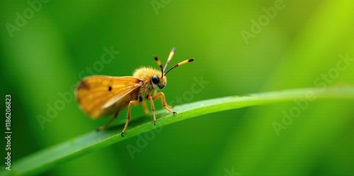 Naklejka premium A tiny moth with feathery antennae rests on a blade of grass, grass, blades,...