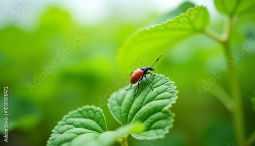 © SwathiFX, Fototapeta premium A tiny red and black beetle on a green leaf