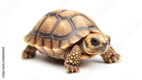 © Srisa, Obraz premium A tiny tortoise slowly making its way forward, isolated on a white background