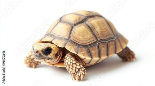 © Srisa, Obraz premium A tiny tortoise slowly making its way forward, isolated on a white background