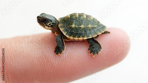 Naklejka premium A tiny turtle perched on a human finger, showcasing its delicate features and...