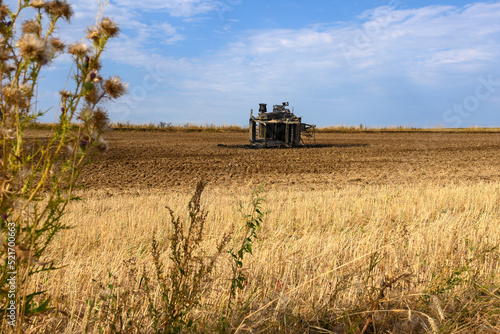 Naklejka premium A tipped over and burnt out hay baler lying in a field in summer