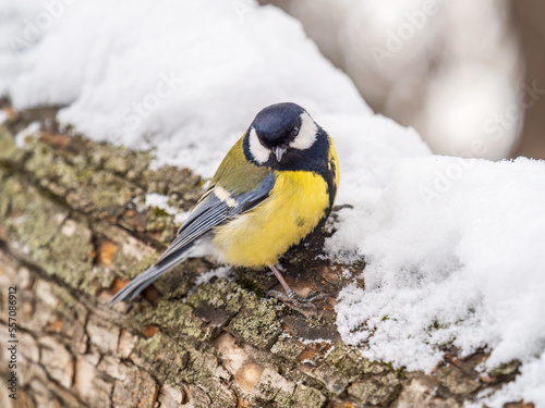© Dmitrii Potashkin, Naklejka premium A tit is looking for food on a tree trunk.