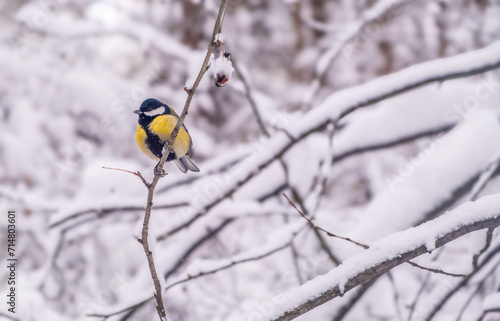 Fototapeta premium A tit is sitting on a branch of a bush against the background of a snowy forest.