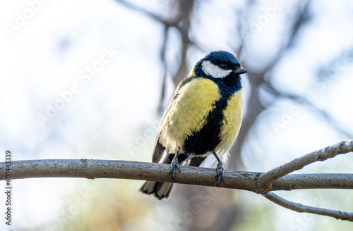 © Сергей Лаврищев, Obraz premium A tit on a tree branch on a spring day.