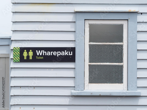 Fototapeta premium A toilet sign in Maori native language of New Zealand. Wharepaku. Male and Female