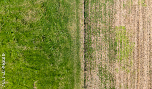 © bugrakaanersoy, Naklejka premium A top down aerial view of a country road or path separating a lush green field from a dry harvested field a beautiful rural scene