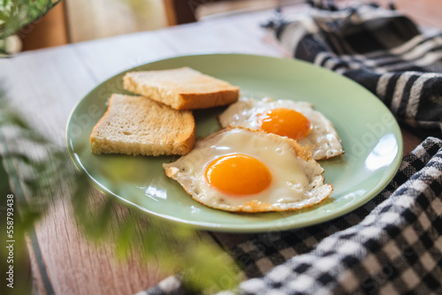 © Dusan, Fototapeta premium A top down and side view of eggs on the plate with toast bread on the side for breakfast clean meal healthy food