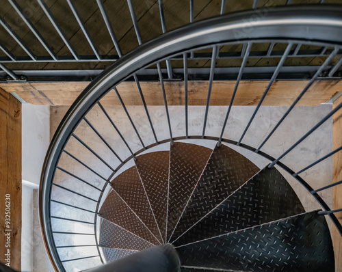 © Suhaino, Fototapeta premium A top-down artistic view of a spiral staircase at Schloss Drachenburg, featuring a striking mix of metal and wood elements, highlighting industrial design with geometric patterns.