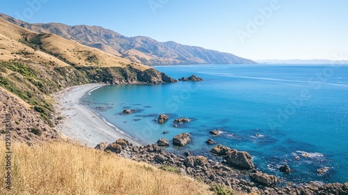 Fototapeta premium A top-down perspective of a secluded bay on New Zealand's coastline, where calm blue waters meet rocky shores.