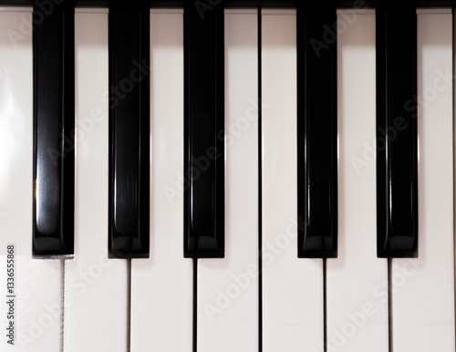© Candra, Naklejka premium A top-down shot of black and white piano keys in alternating pattern.