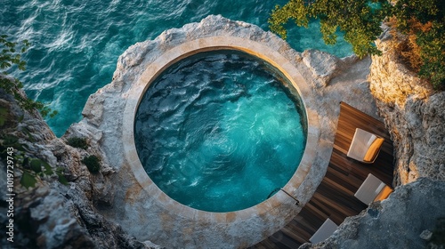 © Paul, Obraz premium A top-down view of a circular saltwater pool with tranquil turquoise water, surrounded by natural stone walls, creating a peaceful spa environment