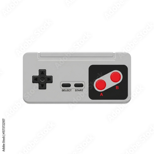 Fototapeta premium A top-down view of a classic grey video game controller with red buttons and a black directional pad.