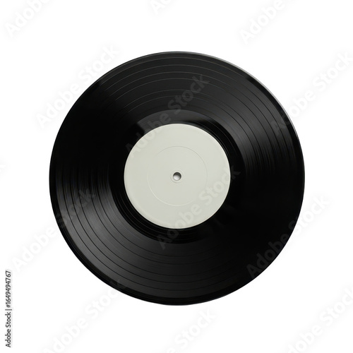 Obraz premium A top-down view of a classic vinyl record with visible grooves, isolated on a pristine white background, perfect for music lovers and collectors