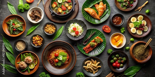 Fototapeta premium A Top Down View of a Diverse Culinary Spread, Featuring Various Appetizers, Main Courses, and Sides on a Dark Surface, Decorated with Greenery, Food Styling, Delicious