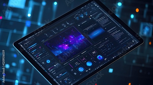 © Matcha_09, Obraz premium A top-down view of a tablet showing AI video generation tools, with visual processing of video content, and clean workspace surrounding it for text.