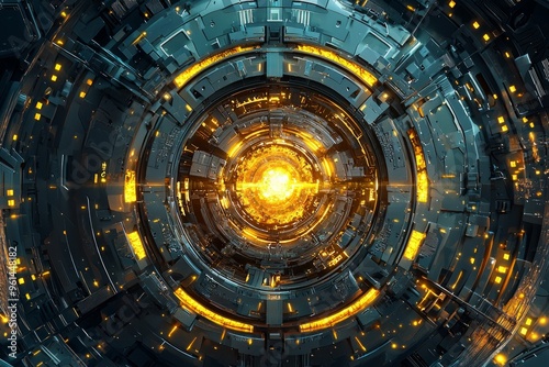Fototapeta premium A top-down view of an advanced energy core, glowing with golden light and...