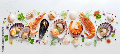Naklejka premium A top view of a beautifully arranged seafood platter, featuring oysters, a...